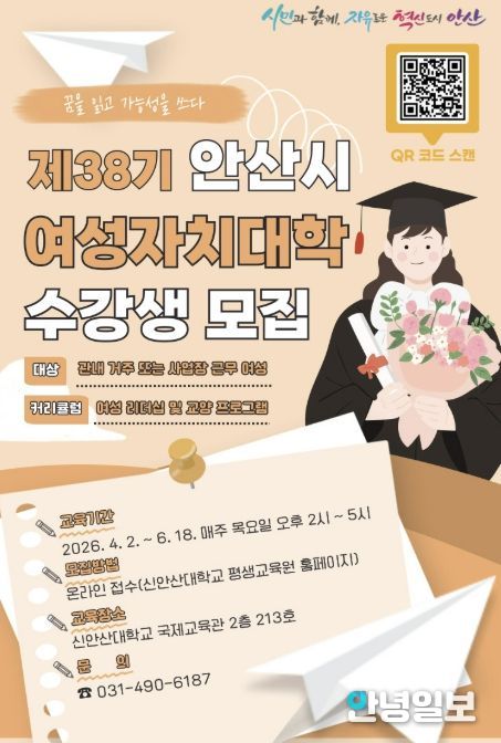 안녕일보 배윤 기자 | 안산시는 지역 여성의 역량 강화와 리더십 함양을 위한 ‘제38기 안산시 여성자치대학’ 수강생을 모집한다고 20일 밝혔다.
