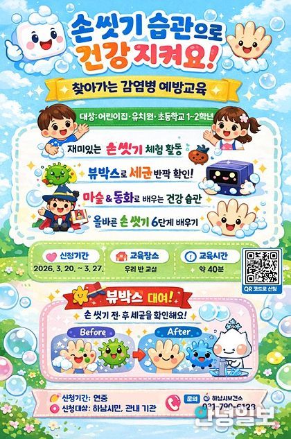 안녕일보 배윤 기자 | 하남시보건소는 오는 4월 6일부터 10월 2일까지 관내 어린이 대상 ‘손 씻기 교육’을 운영하며, 3월 20일부터 27일까지 관내 교육기관을 대상으로 네이버 폼을 통해 교육 신청을 받는다고 밝혔다.
