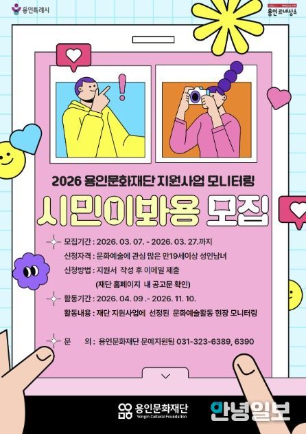 안녕일보 배윤 기자 | 용인문화재단은 오는 27일까지 용인예술창작지원 선정사업을 시민의 시선에 경험하고 평가하는 “2026 용인문화재단 지원사업 모니터링 '시민이봐용'” 참여자를 모집한다.