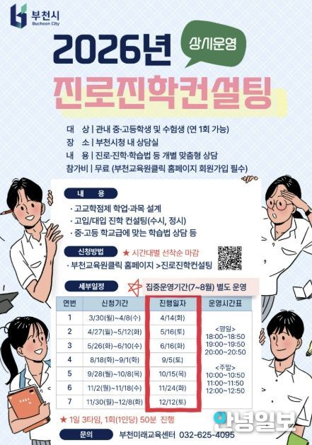 안녕일보 배윤 기자 | 부천시는 관내 중고등학생과 수험생의 자기주도적 진로 설계 역량을 강화하고 급변하는 입시 환경에 선제적으로 대응하기 위해 4월부터 ‘2026년 진로진학컨설팅’을 상시 운영한다.