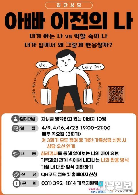 안녕일보 배윤 기자 | 군포시가족센터는 오는 4월 9일부터 4월 23일까지 자녀를 양육 중인 아버지를 대상으로 집단상담 프로그램 ‘아빠 이전의 나’를 운영한다.