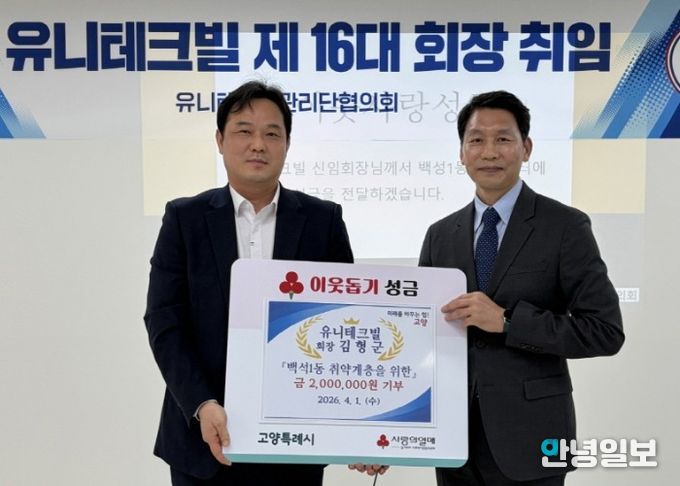 이번 성금은 유니테크빌 김형군 회장이 지역 내 어려운 이웃을 돕기 위해 개인적으로 기부한 것으로, 전달된 성금은 취약계층 지원을 위해 쓰일 예정이다.