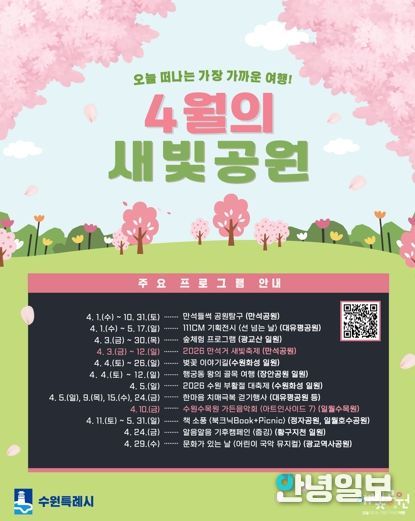 안녕일보 배윤 기자 | 수원특례시는 4월 한 달간 도시공원과 수목원, 도심 주요 공간에서 시민이 참여할 수 있는 다양한 봄 프로그램을 운영한다. 체험·문화·생태·체육 활동을 확대해 공원을 일상 속 여가와 배움의 공간으로 활용할 계획이다.