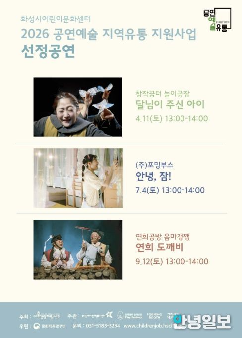 안녕일보 배윤 기자 | 화성시어린이문화센터가 ‘2026 공연예술 지역유통 지원사업’에 선정돼 어린이를 위한 공연 3편을 선보인다.