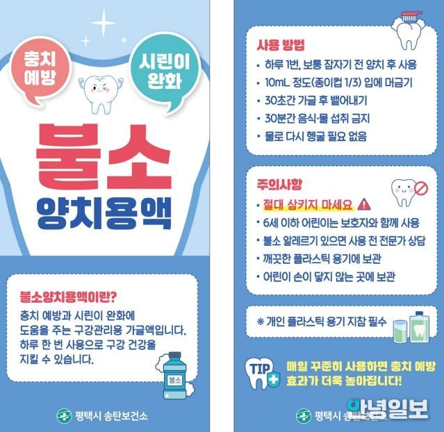 송탄보건소 관계자는 “불소양치는 간단하지만 충치 예방에 매우 효과적인 구강건강 관리 방법”이라며 “시민들이 일상생활에서 쉽게 구강건강 관리를 실천할 수 있도록 다양한 예방 중심 구강보건사업을 지속적으로 추진하겠다”라고 말했다.