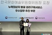안녕일보 배윤 기자 | 군포시 수리동이 전국 3천6백여개 읍면동을 대상으로 한 “2025년 통합문화이용권(문화누리카드) 누락대상자 권리구제 서비스” 부문 우수기관으로 선정됐다. 이에 따라 지난 2월 26일 모두예술극장(서울 서대문구 충정로 7)에서 열린 시상식에서 한국문화예술위원회 위원장상을 수상했다. 문화체육관광부와 한국문화예술위원회가 함께 주관한 이 날 행사는 전국 읍면동 행정복지센터를 대상으로 ‘문화누리카드’를 신청하지 못한 시민을 얼마나 적극적으로 발굴했는지와 시민의 문화 향유권을 보장하기 위해 어떤 노력을 기울였는지를 종합 검토해 총 63곳의 우수기관을 선정했다. 수리동은 카드 발급 대상자의 70% 이상이 고령자인 지역 특성을 고려, 지난 해 미수혜자를 대상으로 ‘직접 찾아가는 적극행정’을 추진하여 카드 발급부터 사용 방법까지 밀착 지원했다. 그 결과 누락대상자의 카드 발급률 91%를 달성하는 높은 성과를 거뒀다. 특히, 수리동이 수상한 한국문화예술위원회 위원장상은 전국 읍면동 행정복지센터 가운데 고령자·장애인 등 문화소외계층을 적극 발굴하여 우수한 실적을 거둔 기관에게 수여되는 상으로 현장 일각에서