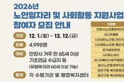 안녕일보 배윤 기자 | 안양시가 1일부터 12일까지 건강하고 활기찬 노후를 위한 ‘2026년 노인일자리 및 사회활동 지원사업’의 참여자 4,998명을 모집한다. 참여자 규모는 유형별로 ▲노인공익활동 3,155명 ▲노인역량활용 1,106명 ▲공동체사업단 574명 ▲취업지원 163명 등이다. 노인일자리사업의 수행기관은 ▲안양시노인종합복지관 ▲비산노인종합복지관 ▲안양시니어클럽 ▲만안·동안노인지회 ▲경기실버포럼 ▲(사)위니버스 ▲시니어복지사회적협동조합 ▲만안구청 ▲동안구청 등 10곳이며, 참여자는 수행기관에서 추진하는 다양한 일자리·사회활동에 참여하게 된다. 신청 자격은 공고일(11월 27일) 기준 안양시에 주민등록이 되어 있는 어르신이다. 세부 기준은 ▲노인공익활동은 65세 이상 기초연금·직역연금 수급자(배우자 포함) ▲노인역량활용은 65세 이상(일부 유형은 60세 이상) ▲공동체사업·취업지원은 60세 이상이다. 다만, 생계급여 수급자(취업지원 제외), 건강보험 직장가입자, 장기요양등급자 등 일부 대상자는 신청이 제한된다. 희망자는 신분증과 주민등록등본 등을 지참하고 해당 수행기관 또는 거주