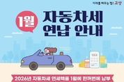 안녕일보 배윤 기자 | 고양특례시 덕양구는 2026년 1월 자동차세 연납 납부서 63,688건을 발송하고, 오는 2월 2일까지 신규 연납 신청을 받는다고 15일 밝혔다. 자동차세 연납 제도는 매년 6월과 12월에 부과되는 정기분 자동차세를 1월에 한 번에 납부할 경우, 2월부터 12월분 세액의 5%를 공제해 주는 제도다. 이를 통해 납세자는 연세액 기준 약 4.5%의 절세 효과를 누릴 수 있다. 연납 신청은 매년 3월, 6월, 9월에도 가능하지만, 잔여기간에 따라 공제율이 차등 적용되므로 1월에 납부해야 가장 높은 할인 혜택을 받을 수 있다. 전년도에 자동차세를 연납한 차량은 소유권 변동이 없다면 별도의 신청 없이 공제된 금액이 기재된 납부서를 받아볼 수 있다. 다만, 신규 차량 취득자나 처음 연납을 신청하려는 납세자는 기한 내에 신청해야 한다. 자동차세 연납은 위택스를 통한 온라인 접수나 관할 구청 세무과로 전화 또는 방문 신청할 수 있다. 신청 후 납부하지 않더라도 오는 6월과 12월 정기분으로 과세되며 이에 따른 불이익은 없다. 납부는 전국 모든 은행의 CD/ATM기, 위택스, 전