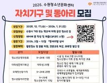 안녕일보 배윤 기자 | 수원시청소년청년재단 수원청소년문화센터는 청소년의 자치 역량 강화와 문화 활동 참여 확대를 위해 '2026년 수원청소년문화센터 자치기구 및 동아리' 단원을 모집한다. 이번 모집은 1월 31일까지 진행되며, 수원시에 거주하거나 관내 학교에 재학 중인 청소년이라면 누구나 지원할 수 있다. 신청은 포스터 내 QR코드를 통한 네이버 폼 온라인 접수로 가능하다. 모집 분야는 △청소년운영위원회 △대학생문화기획단 △국제친선동아리 등으로 구성되며, 예술·미디어·기획·국제교류·생활체육 전반을 아우르는 프로그램이 운영될 예정이다. 특히 자치기구는 청소년 시설·프로그램 모니터링과 축제 기획, 지역사회 교류를 통해 주도적인 참여 경험을 제공한다. 선발된 청소년은 3월부터 12월까지 동아리별 특성에 맞는 활동에 참여하게 되며 △활동 공간 및 물품 지원 △전문가 교육 및 멘토링 △행사 기획·운영 실습 △위촉장 발급 등 다양한 혜택을 제공받는다.