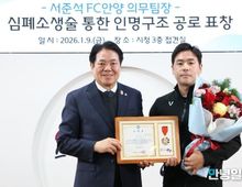 안녕일보 배윤 기자 | 안양시민프로축구단 FC안양의 서준석 의무팀장이 위급한 상황에서 신속한 심폐소생술로 시민의 생명을 구한 공로로 안양시장 표창을 받았다. 안양시는 9일 오후 4시10분 시청 3층 접견실에서 표창 수여식을 열고 서 팀장에게 표창을 수여했다. 서 팀장은 지난해 12월 26일 안양종합운동장 인근에서 점심식사를 하던 중 식당 앞에서 심정지로 쓰러진 시민을 발견하고 즉각 심폐소생술(CPR)을 실시했으며, 구조대가 도착할 때까지 침착하게 응급조치를 이어가 소중한 생명을 구하는 데 결정적인 역할을 했다. 2014년부터 FC안양에 재직 중인 서 팀장은 평소 선수단의 건강과 안전을 책임지는 의료지원 업무를 수행해 왔으며, 이번 위급한 상황에서도 전문성과 사명감을 바탕으로 인명 구조에 나서 사회에 귀감이 되는 행동을 보여줬다. 서 팀장은 “현장에서 함께 신고하고 도움을 준 동료들 덕분에 소중한 생명을 지킬 수 있었다”며 “앞으로도 그라운드 안에서는 선수들의 건강을, 그라운드 밖에서는 시민의 생명을 지키는 데 최선을 다하겠다”고 소감을 밝혔다. 최대호 안양시장은 “갑작스러운 상황에서도
