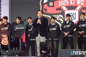 안녕일보 배윤 기자 | 이재준 수원특례시장이 29일 ‘2025 kt 위즈 팬페스티벌’에서 “팬 한분 한분의 열렬한 응원을 발판 삼아 내년 시즌에도 ‘마법 같은 경기’ 펼치길 응원한다”며 “앞으로도 변함없는 응원과 우렁찬 함성으로 kt위즈와 함께 해주시길 바란다”고 말했다. 수원컨벤션센터 전시홀에서 열린 이날 행사에는 kt 위즈 야구팬(시즌권 회원 등), kt 위즈 1·2군 선수 등 5000여 명이 참석했다. 행사는 팬 사인회, 야구 꿈나무 대상 체험 레슨, 팬과 선수가 함께하는 듀엣 가요제 등으로 진행됐다.