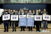안녕일보 배윤 기자 | 화성특례시와 전국공무원노동조합 화성시지부가 3일 시청 대회의실에서 ‘2025년 하반기 공무원 노사협의회’를 개최했다. 이날 협의회에는 정명근 화성특례시장과 최태성 전국공무원노동조합 화성시지부장을 비롯한 시 집행부, 노조 간부 등 18명이 자리해, 신뢰와 존중을 바탕으로 한 건강한 조직문화 조성을 위해 협력하기로 했다. 협의회는 ▲베스트 간부공무원에 대한 시상 ▲직장 내 괴롭힘 설문조사 결과보고 ▲노사협력 활동 제안 ▲부서별 노사협의 안건 논의 순으로 진행됐다. 특히, 노사 양측은 직장 내 괴롭힘 실태와 조직문화 개선 방안을 중심으로 진솔한 의견을 나누며, 상호 존중과 소통이 살아 있는 공직문화 확립을 위한 다양한 방안을 모색했다. 또한, ‘화성특례시 모두의 약속’ 퍼포먼스를 통해 청렴과 공정, 평등의 가치를 함께 되새기며 건강한 조직문화 정착을 위한 노사 간 의지를 다졌다. 정명근 화성특례시장은 “건강한 조직문화는 노사 모두가 함께 만들어가는 가치”라며 “시 또한 열린 자세로 소통하며 시와 노동조합이 서로 신뢰를 더욱 굳건히 해 함께 성장하는 공직사회를 만들어가겠