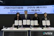 안녕일보 배윤 기자 | 고양산업진흥원이 지난 10일 오전 고양 스마트시티센터 오픈랩에서 중국 절강성 구주시 상무국과 공동협력을 위한 업무협약(MOU)을 체결했다고 밝혔다. 협약 체결식에는 여민초 구주시 상무국 부국장, 란소방 공상연합회 부주석, 여경창 흥융상무발전유한공사 대표 등 구주시 방한단과 고양산업진흥원 한동균 원장, 최아람 고양투자청장 등이 참석했다. 이날 행사는 ▲양 기관 대표 인사 ▲홍보 동영상 상영 및 기관 소개 ▲업무협약 체결 ▲업무 협의 등의 순으로 진행됐다. 협약을 계기로 정보통신, 콘텐츠 등 산업, 창업, 문화 등 분야에서 공동협력 할 계획이다. 구주시는 절강성 서부에 위치한 인구 230만 명의 도시로 기계, 화학 공업 등이 발달해 있고 한국기업이 진출해 있다. 여민초 부국장은 “고양시의 첨단산업단지 계획과 아쿠아스튜디오 등에 대해 알게 됐다. 양 도시 기업인 간의 협력 활성화를 기대한다.”고 말했다. 한동균 원장은 “오늘 협약이 고양시와 구주시 간 교류의 발판이 되고, 공동 발전할 수 있는 계기가 되길 바란다”고 말했다.