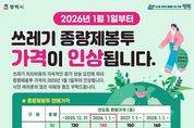 안녕일보 배윤 기자 | 평택시는 2026년 1월 1일부터 쓰레기 종량제 봉투 가격을 3개년도에 걸쳐 인상한다. 그동안 평택시는 인구증가, 물가상승, 생활 쓰레기 수집 운반 처리비용 증가에도 불구하고 2006년 이후 종량제봉투 가격을 동결해 왔다. 시 관계자는 “현재 평택시의 종량제 가격은 경기도 31개 시군 가운데 최하위 수준이며, 청소예산 재정자립도와 주민부담률이 낮아 가격 인상은 불가피하다”고 밝혔다. 따라서, 대표적으로 일반용 종량제봉투 20리터는 현재 500원에서 110원 인상된 610원으로, 음식물 전용 봉투 1.5리터는 현재 40원에서 20원이 인상된 60원으로, 공동주택에 설치된 음식물종량제기기(RFID)는 1㎏ 단위로 현재 48원에서 12원 인상된 60원으로, 경기도 내 31개 시군 평균 가격을 반영하여 인상안을 마련했다. 다만, 서민경제의 어려움과 시민부담을 고려하여 가격 인상은 3개년도에 걸쳐 단계적으로 시행할 예정으로, 시 관계자는 “종량제봉투 가격 인상에 대한 시민 여러분의 많은 이해와 협조를 부탁드린다”며 “앞으로도 쾌적하고 청결한 도시환경 조성은 물론 질 높은 청소행정 서비