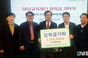 안녕일보 배윤 기자 | NH농협은행 하남시지부는 하남시 지역인재 양성을 위해 하남교육재단에 장학금 3백만원을 기탁했다. NH농협은행 하남시지부는 하남시 인재 육성을 위해 12년동안 꾸준히 장학금을 지원하고 있으며, 이번 기탁금은 하남시 학생들의 학업지원에 활용할 예정이다. 이석표 지부장은“지역 학생들의 성장과 미래를 응원하는 마음으로 장학금을 전달했다”며 “앞으로도 지역인재 양성을 위한 다양한 지원을 이어가겠다”고 말했다. 이현재 시장(하남교육재단 이사장)은 “NH농협은행 하남시지부의 꾸준한 관심과 후원에 감사드린다”며 “기탁금이 학생들의 꿈을 키우는 데 도움이 되도록 소중히 사용하겠다”고 밝혔다. 하남교육재단은 관내 초·중·고등학생들을 대상으로 장학사업을 비롯해 캠퍼스 투어, 기업체험, 진로·진학 프로그램, 학부모 교육 등 다양한 교육 지원 사업을 운영하고 있으며, 매년 약 3만여명의 학생들이 교육서비스를 제공받고 있다.