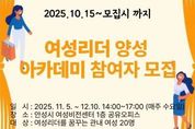 안녕일보 배윤 기자 | 안성시는 지역사회 발전을 이끌 열정있고 능력있는 여성 지도자를 발굴·육성하기 위해 ‘2025년 안성시 여성리더 양성 아카데미’ 기본과정 교육 참가자를 모집한다. 이번 아카데미는 적극적으로 참여할 수 있는 여성 시민 누구나 신청할 수 있으며, 신청기간은 오는 10월 15일부터 시작된다. 교육은 11월 5일부터 12월 10일까지 6주간 매주 수요일에 안성시여성비전센터 (발화대길 25) 1층 공유오피스에서 진행 될 계획이다. 교육 내용은 ‘나는 당신이 행복했으면 좋겠습니다.’ 라는 주제로 김경희 강사의 행복소통 리더십 강의로 개강식을 열고 2~3주차는 감성을 담아 나를 알리는 SNS 활용법 이론편과 실습편, 4~5주차에는 나만의 비서 만들기 챗봇과 생성형 AI교육 이론편과 실습편을 구성하여 최신 트렌드에 맞춘 리더 역량 강화를 위한 강의들로 구성했으며 6주차에는 퍼실리테이션 기법을 활용하여 지역 내 현안 문제를 파악하고 리더로서 해결 방법을 제시하는 과정을 마지막으로 수료식을 가질 예정이다.