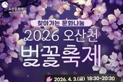 안녕일보 배윤 기자 | 오산문화재단은 오는 4월 3일 오후 6시 30분 오산천 야외무대(종합운동장 뒤편)에서 시민들과 함께하는 봄맞이 ‘2026 오산천 벚꽃 축제’를 개최한다. 이번 행사는 따뜻한 봄의 시작을 알리며 시민들에게 특별한 추억을 선사하기 위해 마련된 것으로, 가수 황민호의 축하 공연을 비롯해 점등식과 폭죽 퍼포먼스가 어우러져 오산천 일대를 화려한 봄밤의 분위기로 물들일 예정이다. 행사 당일에는 음악과 빛, 불꽃이 조화를 이루는 다양한 프로그램이 진행되며, 남녀노소 누구나 함께 즐길 수 있는 열린 문화행사로 시민들의 큰 호응이 기대된다. 오산문화재단 관계자는 “오산천에서 펼쳐지는 이번 축제가 시민들에게 특별한 봄밤의 추억으로 남길 바란다”며 “앞으로도 시민들이 일상 가까이에서 문화와 예술을 향유할 수 있도록 다양한 프로그램을 지속적으로 마련하겠다”고 밝혔다.
