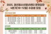 안녕일보 배윤 기자 | 수원시청소년청년재단 권선청소년청년센터는 오는 9월 16일부터 9월 26일까지 지역사회 평생학습 문화강좌 4분기(10~12월) 수강생을 모집한다. 10월부터 12주 동안 운영하는 이번 문화강좌 내용으로는 ▲농구 ▲발레(유아·청소년) 6개의 청소년 강좌와 프롭(Prob)을 이용하는 ▲프롭테라피; 바른 몸 만들기 강좌를 포함해 ▲필라테스 및 요가 성인 대상 4개 강좌를 개설하여 청소년과 지역주민들에게 건강한 여가생활과 문화 활동의 기회를 제공하고자 한다. 권선청소년청년센터 관계자는 “수강생의 수요가 높은 인기강좌를 지속적으로 운영하여 기존수강생의 만족도와 재수강률이 높으니 많은 관심과 참여 바란다.”고 전했다.