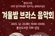 안녕일보 배윤 기자 | 김포시 통진도서관은 오는 12월 23일 저녁 7시부터 8시까지 다가오는 연말을 기념하여 온 가족이 함께 즐길 수 있는 브라스 음악공연을 운영한다. 이번 공연은 경기아트센터에서 지원하는 ‘찾아가는 문화복지공연’ 사업으로, 김포시 북부권 시민들을 대상으로 일상 가까이에서 문화예술을 만나는 기회를 제공하고, 지역 간 문화 격차를 완화하고자 기획했다. 이번 공연은 금관 5중주로 구성된 앙상블 코리안아츠의 풍성한 선율로 채워질 예정이며, 코리안아츠는 대한민국 국제관악제 홍보대사와 2018년 평창동계올림픽 개막식 《승리의 팡파레》를 연주하는 등 화려한 이력을 지닌 팀으로, 클래식은 물론 영화와 대중음악 등 다양한 장르를 넘나들며 새로운 음악적 시도를 이어가고 있다. 도서관 관계자는 “이번 공연은 영화 및 애니메이션 음악공연으로 누구나 쉽게 즐길 수 있으며, 이번 공연을 통해 온 가족이 따듯한 연말을 보내길 바란다”라고 말했다.