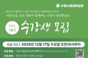안녕일보 배윤 기자 | 수원시평생학습관이 12월 17일 오전 10시부터 2026년 1분기 수강생을 모집한다. 1월부터 3월까지 운영되는 1분기 강좌는 ▲첨단미래기술 프로그램 ▲디지털 지식정보 프로그램 ▲생활문화 프로그램 ▲교양 프로그램 ▲인문 프로그램 ▲기관 협력 재능기부 프로그램 ▲거북이공방 프로그램 ▲대상별 맞춤프로그램 ▲시민교육 프로그램 ▲언제든학교 시민기획 프로그램 ▲무지한스승의만남 시민참여기획 프로그램 등 총 11개 과정, 115개 세부 강좌로 구성됐다. 첨단미래 기술 프로그램을 강화했다. 인공지능(AI) 기술에 초점을 둔 첨단미래기술 프로그램, 성균관대학교 지능로봇리빙랩과의 협업을 통한 자율주행 실습, 가상현실(VR)드론 시뮬레이션 체험 등이 있다. 또 글쓰기, 사주명리학, 한글 서예, 현대미술, 명화감상, 뮤지컬 등을 주제로 한 교양 프로그램과 중장년, 시니어, 제2의 인생설계, 청소년 등을 대상으로 하는 대상별 맞춤 프로그램을 마련했다. 수원시는 새빛톡톡 시민 설문조사를 활용해 2026년 강사를 공개 모집했고, ▲생활문화 프로그램 ▲디지털 지식정보 프로그램 ▲대상별 맞춤프로그램 ▲첨
