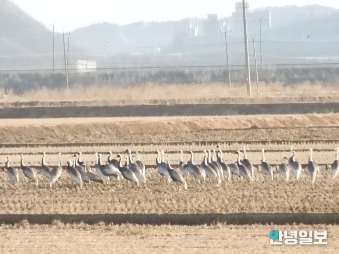 안녕일보 배윤 기자 | 김포시가 지난 17일 재두루미 50여 마리의 무리가 재두루미 취·서식지 보전사업지인 하성면 후평리 들녘과 인근 한강하구에서 먹이를 먹고 휴식을 취하는 모습이 포착됐다고 전했다.