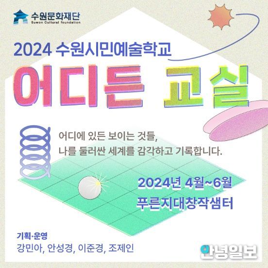 안녕일보 배윤 기자 | 수원문화재단은 경기시민예술학교 수원캠퍼스의 후속사업으로 2024 수원시민예술학교 '어디든 교실'을 수원시민에게 선보인다.