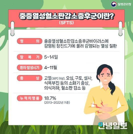 중증열성혈소판감소증후군(SFTS)은 매개체인 진드기가 활동하는 봄부터 가을까지 주로 발병하며, 중증열성혈소판감소증후군(SFTS) 바이러스를 보유한 작은소참진드기에 물려 감염된다. 초기에 40도가 넘는 발열, 피로, 식욕 저하, 구토, 설사, 복통 등의 소화기계 증상이 나타나고 두통, 근육통, 림프절이 붓는 증상이 동반되기도 한다.