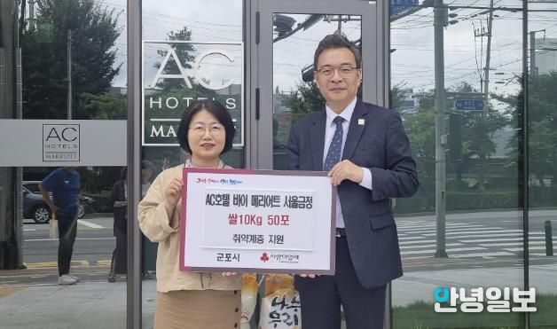 안녕일보 배윤 기자 | 지난 23일 군포시는 금정동 소재 AC호텔바이 메리어트 서울금정(대표 박혜정, 공배)으로부터 쌀 500kg(10kg 50포)를 전달받았다.