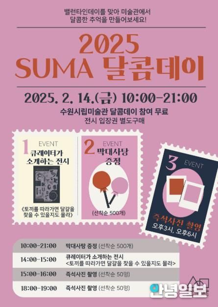 안녕일보 배윤 기자 | 경기도 수원시립미술관은 밸런타인데이를 맞아 미술관에서 달콤한 하루를 보낼 수 있는 'SUMA 달콤데이'를 2월 14) 수원시립미술관 행궁 본관에서 운영한다.
