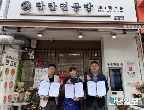 안녕일보 배윤 기자 | 파주시 문산읍과 문산읍 지역사회보장협의체는 지난 19일 탄탄면공방 파주문산점과 ’재능기부 행복나눔가게‘ 협약식을 체결했다.
