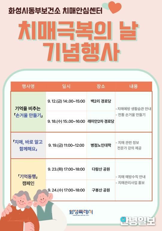 안녕일보 배윤 기자 | 화성시동부보건소가 제18회 치매극복의 날을 맞아 12일부터 24일까지 치매 예방과 인식 개선을 위한 기념행사를 운영한다.