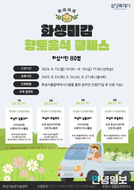 ‘화.성.미.감(華.城.味.感)’ 향토음식 교육은 오는 23일부터 27일까지 3일간 총 4회에 걸쳐 화성시농업기술센터와 화성시생활문화창작소에서 진행된다.