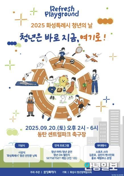 안녕일보 배윤 기자 | 화성특례시는 오는 20일 오후 2시부터 6시까지 동탄 센트럴파크 축구장에서 ‘2025년 청년의 날 기념행사’를 개최한다고 밝혔다.