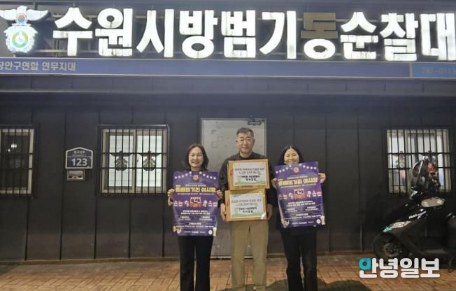 안녕일보 배윤 기자 | 수원시 장안구 연무동은 지난 28일 연무동 자율방범대 초소를 방문하여 대원들의 노고를 격려하고 봉사에 대한 감사의 마음을 담은 격려 물품을 전달했다.