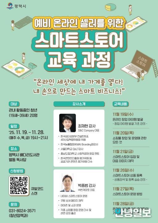 안녕일보 배윤 기자 | 평택시는 오는 11월 19일부터 28일까지 매주 수, 목, 금요일 오후 7시부터 9시까지 평택시 배다리도서관 별동 독서당에서 ‘예비 온라인 셀러를 위한 스마트스토어 교육’강좌를 개최하고, 참여자 20명을 모집하고 있다고 밝혔다.