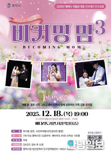 안녕일보 배윤 기자 | 평택시는 오는 12월 18일 오후 7시 배다리도서관 1층 시청각실에서 저출생 대응 인식개선 인구교육의 하나로 ‘비커밍맘 시즌3’ 갈라 뮤지컬 공연을 개최한다고 밝혔다.