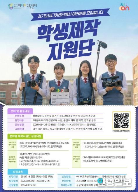 하미진 경기도교육청미디어교육센터장은 “청소년방송 학생 제작지원단은 미디어분야 진로를 희망하는 학생에게 깊이 있는 학습을 제공하는 과정”이라며 “경기도교육청미디어교육센터가 학생 중심 미디어교육의 거점 기관으로서 역할을 더욱 강화해 나가겠다”고 말했다.