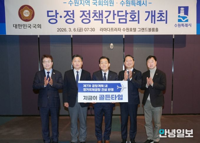 안녕일보 배윤 기자 | 이재준 수원특례시장은 6일 라마다프라자 수원호텔에서 열린 지역 국회의원들과 당·정 정책간담회에서 “제7차 공항개발 종합계획에 ‘경기국제공항’ 건설 내용이 반영될 수 있도록, 경기도와 협의해 달라”고 요청했다.