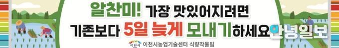 안녕일보 배윤 기자 | 이천시농업기술센터는 최근 벼 등숙기 기온이 상승하면서 쌀의 외관 품질과 밥맛이 떨어지고 있어 등숙기 고온을 피할 수 있도록 알찬미 모내기를 기존보다 5일 늦게 하도록 당부하고 있다.