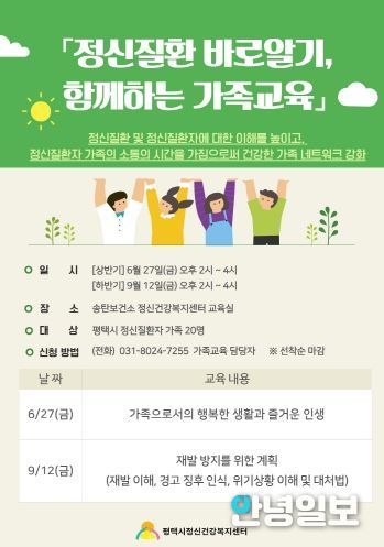 안녕일보 배윤 기자 | 평택시 송탄보건소 정신건강복지센터는 정신질환 가족의 역량 강화 및 권익증진을 위해 정신질환자 가족을 위한 교육 프로그램을 운영할 예정이다.