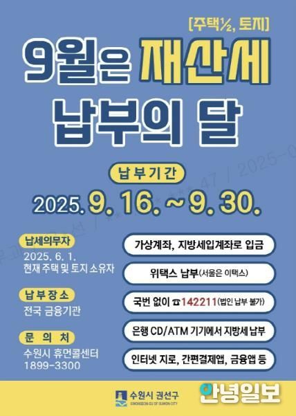 안녕일보 배윤 기자 | 수원시 권선구는 2025년 9월 정기분 재산세 551억원을 부과한다. 이는 전년 대비 21억원(3.9%)가 증가한 것으로, 주택가격 및 공시지가의 상승이 세액 증가의 주요 원인으로 분석된다.