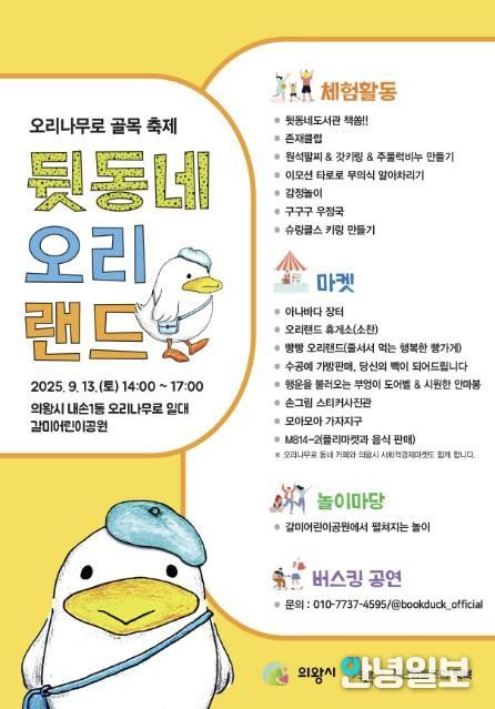 안녕일보 배윤 기자 | 의왕시는 관내 청년단체 청년공간 뒷북이 9월 13일 오후 2시 관내 오리나무로 일대(내손동 806번지)에서 '뒷동네 오리랜드 마을축제'를 개최한다고 밝혔다.