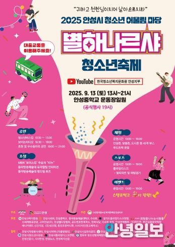 안성시는 오는 9월 13일 오후 1시부터 9시까지, 안성중학교 운동장 일대에서 ‘2025 안성시청소년어울림마당-별하나르샤 청소년축제’를 개최한다고 밝혔다.