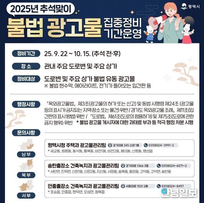 안녕일보 배윤 기자 | 평택시는 민족 최대의 명절인 ‘25년 추석을 맞아 불법 광고물 집중 정비 기간을 운영한다고 11일 밝혔다.