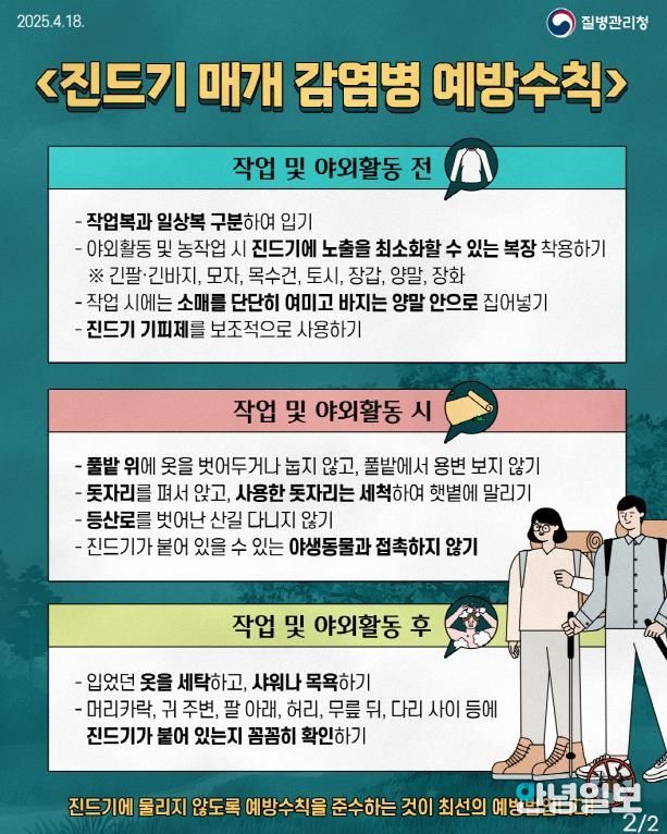 진드기 매개 감염병을 예방하기 위해서는 ▲야외 활동 시 피부 노출을 최소화하는 복장(긴소매, 긴바지, 모자 등)을 착용하고 ▲진드기 기피제를 뿌리고 ▲풀밭에 앉을 때 돗자리를 사용하며 ▲귀가 후에는 즉시 옷을 털어서 세탁하고 ▲샤워하면서 몸에 진드기가 붙어있는지 확인하기 등 예방수칙을 준수해야 한다.