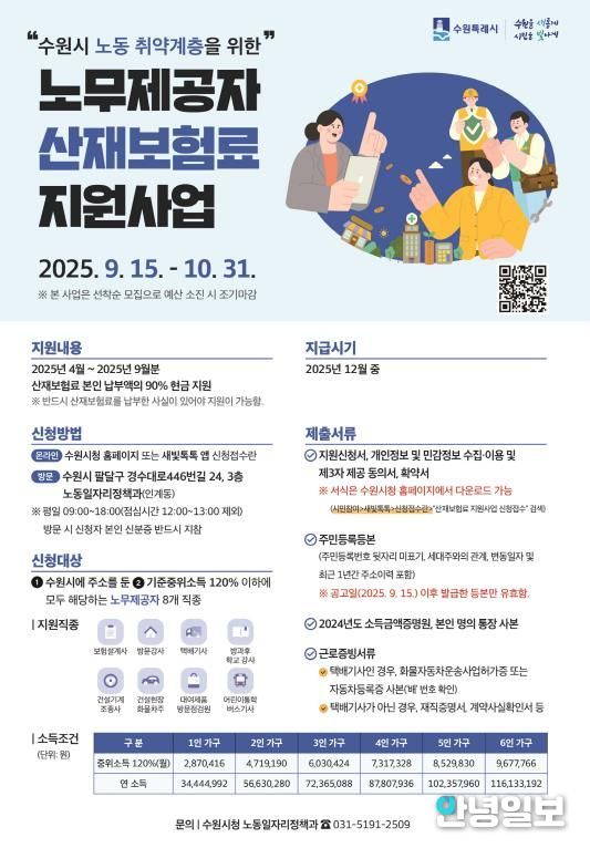 안녕일보 배윤 기자 | 수원시는 10월 31일까지 ‘2025년 하반기 노동 취약계층 노무제공자 산재보험료 지원사업’ 신청을 받는다.