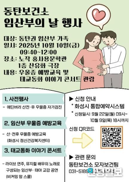 기념행사에서는 동탄권역 예비 부모 35쌍(70명)을 대상으로, ▲산전·후 우울증 예방 특강(화성시정신건강복지센터) ▲태교 동화 이야기 콘서트 등 임산부를 위한 프로그램이 운영된다.