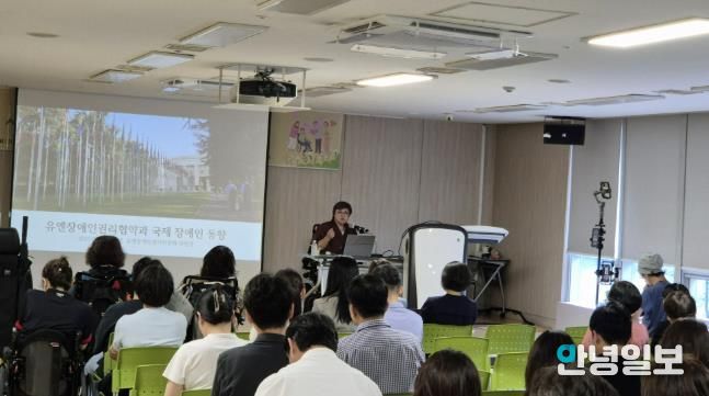 이날 교육은 김미연 유엔(UN)장애인권리위원회 위원장이 강사를 맡아 △유엔(UN)장애인권리협약 △국제사회의 장애인 인권 현황 △장애인 인권 실현을 위한 사회적 실천 방향 등을 주제로 강의했다.