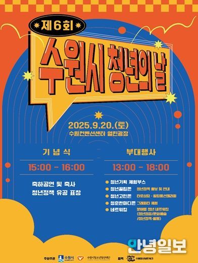 안녕일보 배윤 기자 | 수원시청소년청년재단은 오는 20일 수원컨벤션센터 열린 광장에서 2025. 제6회 청년의 날 기념행사를 개최한다고 밝혔다.