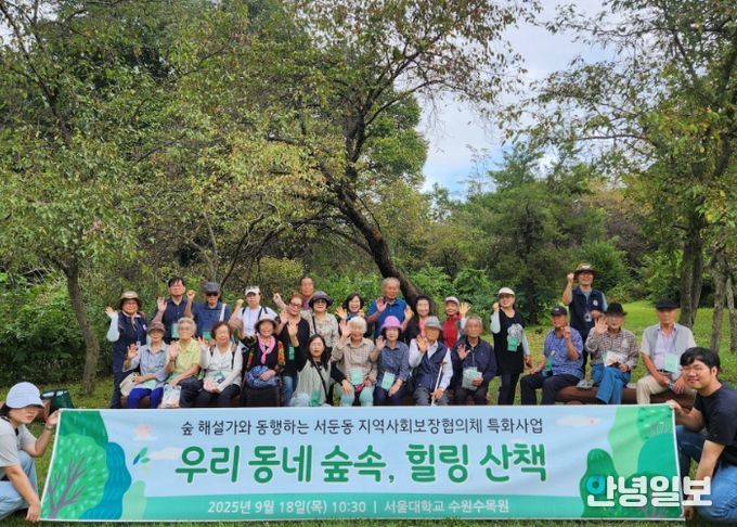 안녕일보 배윤 기자 | 수원시 권선구 서둔동 지역사회보장협의체는 지난 18일, 관내 어르신 20명을 모시고 서울대농대 수원수목원에서‘우리 동네 숲속, 힐링 산책’숲 체험 나들이를 진행했다.